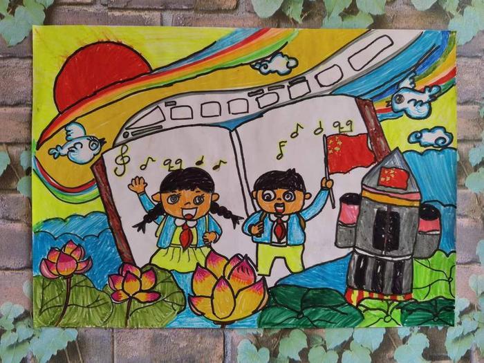 吕骁峻心目中的校园,荷花盛开在小池塘中,有火箭造型的建筑,有大大的书的造型墙壁,真是一所有特点的校园啊!