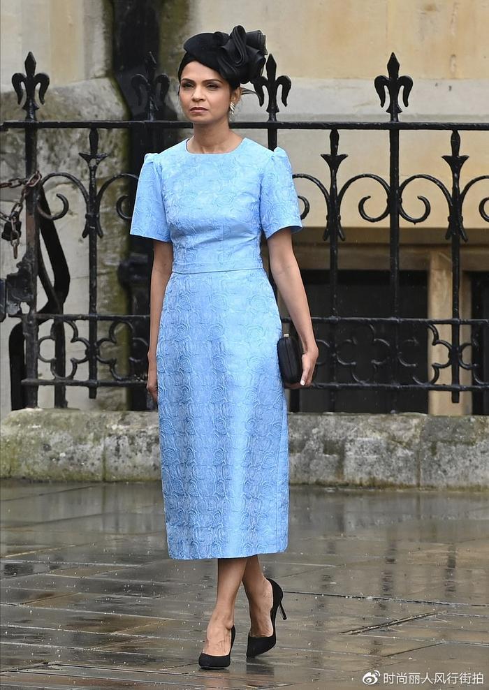 这是英国第一夫人,苏纳克夫人在这样的场合,以玫瑰蓝裙造型亮相,尽管配上了高贵的礼帽,气质却还是欠缺了一些。即使是印度富豪千金,如今是英国第一夫人,却在第一夫人比拼中,彻底输了。