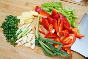 2、准备辅料,青红椒洗净去蒂去籽切成菱形片,生姜去皮切片,绕一根葱结,其余葱白切段、后半部分切葱花,大蒜剥皮拍打后切块备用。另准备一小把花椒、两瓣八角、三片香叶和几瓣干辣椒。