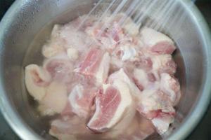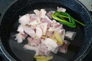 3、鸭块泡出血水后冲洗干净,锅中加适量清水,加入一部分切好的姜片和葱结,倒入两勺料酒去腥,把鸭块倒入冷水锅中,开大火烧开后,撇去浮沫,焯水两分钟后捞出控水备用。