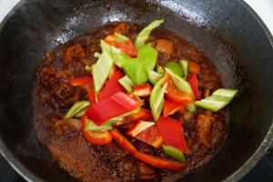 6、30分钟后鸭块熟透,小火转大火收汁,口重的可以再补上少许食盐,倒入切好的青红椒,翻炒至辣椒断生即可关火出锅装盘,撒上白芝麻和葱花,一道浓郁鲜香的啤酒鸭就做好了。