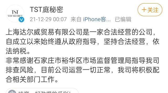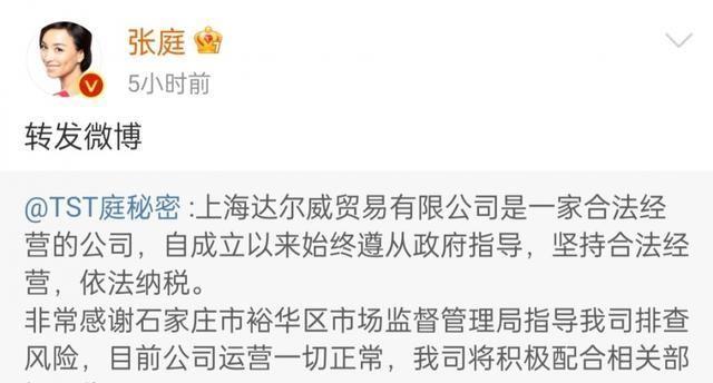 但就在12月28日晚间,张庭夫妇创立的公司被爆涉嫌传销,石家庄市裕华区市场监督管理局以查证函的形式揭露了品牌名为“TST庭秘密”的运营公司——上海达尔威贸易有限公司涉嫌传销的事实。