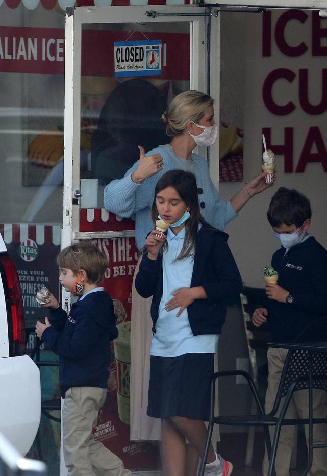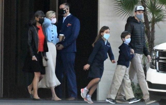 伊万卡一家五口的同框是非常养眼的,从比基尼换成更加女人味私服后的伊万卡选择了一件天蓝色开衫,除了胸前黑色纽扣的存在以外,没有任何色彩与元素点缀着的开衫是超级烘托出伊万卡的气质来,而且极显肤色白皙的颜色也将伊万卡本就不算黝黑的肌肤衬托得更为透亮。
