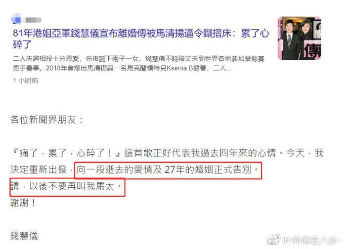 近日,港姐钱慧仪宣布离婚的声明在发出之后引起了大家的关注。在声明之中,她写道“今天我决定重新出发,向一段逝去的爱情及27年的婚姻正式告别,请以后不要再叫我马太,谢谢。”在她的这一则声明里面,她提到自己过去这四年里过得很是艰辛,完全可以用“累了,痛了,心碎了”这几个词来形容。近日她终于下定决心要结束这一段感情,所以才将这一离婚声明发出来。