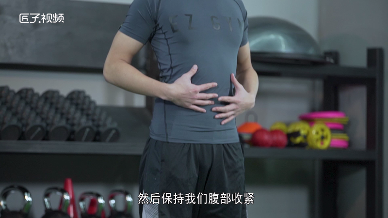 双腿自然分开,左脚迈出,左手叉腰,腹部收紧,注意我们在整个下的时候保持背部挺直,然后左膝盖微屈,使我们右手摸到左脚脚尖,保持臀部大腿后侧肌肉收紧;
