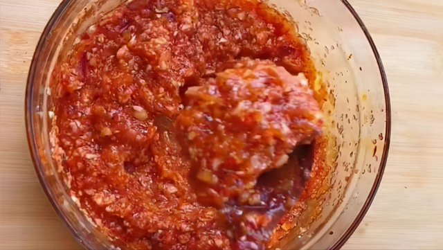 第五步:全部涂抹好后,将它们一层层地叠放到一张大碗或者盆中,腌制一个做法小时就苏可以吃了,腌制这个苏子叶辣椒酱不需要过多各式各样的调料,这样简单拌一拌,就特别懒人的好吃了。