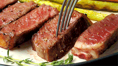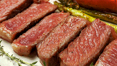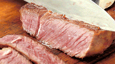 *肉眼取自牛的肋脊部位,瘦肉和肥肉兼有,由于含一定肥膘,煎烤后味道比较香,鲜嫩多汁。