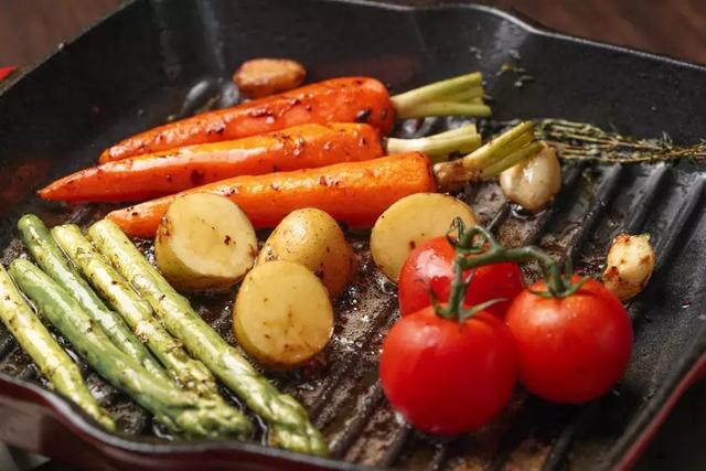 8、用锅里煎牛排剩余家里的油将蔬菜煎至金黄在家上色配料后,盛出摆盘铁锅,家庭煎牛排大火还是小火。