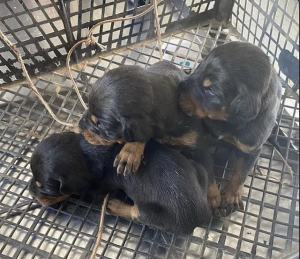 而它身边不远处的角落里,还偎依着三只黑色的小奶狗。