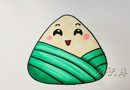 第6步:然后再用浅绿色和深绿色涂一下粽叶,那么这个带颜色的粽子简笔画就画好啦,简单又可爱!