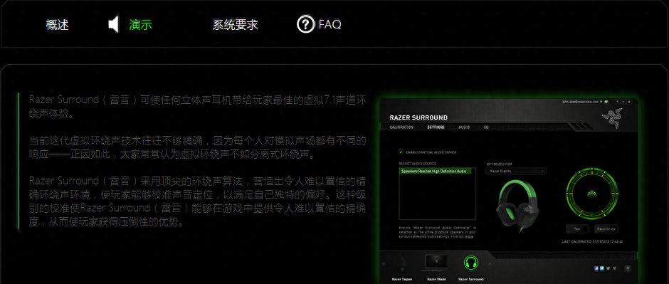 我们来看看这款耳机对于7.1声道的介绍:Razer Surround(雷音)可使任何立体声耳机带给玩家最佳的虚拟7.1声道环绕声体验。
