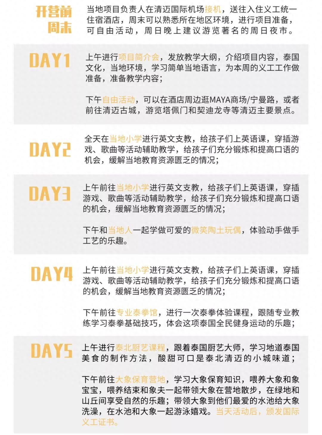 君行所有活动都给出了每一天上午下午的明确说明,这样明确了义工成分的比例,避免义工活动打折扣,也让承诺的文化体验活动或是旅游活动落到明文实处。如君行泰国清迈国际义工项目,住宿在城区接近宁曼路的位置,泳池酒店2人一间,独立卫浴有热水有空调,日程给出了每天的具体说明,为当地小学支教,还包含泰拳,厨艺课程,陶艺课程,和大象保育营地体验,价格2650没有额外会员费。