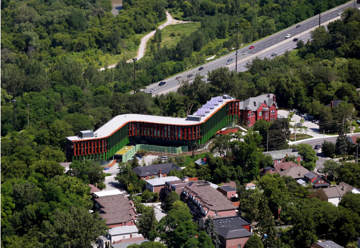 这座建筑位于峡谷之上,是为圣约瑟夫修女会——该市最古老的教会之一,提供的一个具有医疗设施和辅助生活功能的住宅。项目由Shim Sutcliffe建筑事务所设计,这也是事务所首次涉足医疗保健设计领域。建筑弧形的结构与周围的景观融为一体,中心是一个圆形的小教堂。这座四层楼高、面积达8900㎡的设施为年长的修女们提供了58间住宅套房。宽大的窗户提供了充足的自然光,而外部则由风化钢包覆,被锈蚀成引人注目的深红色和翠绿色。