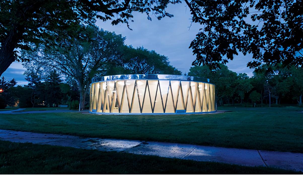 在过去的十年里,埃德蒙顿举办了许多设计竞赛,对现代建筑进行了大量投资,以重新焕发公共空间的活力。博登公园尤其受益于这种关注度的提高,公园里的亭子是一个圆形的建筑,由92个V形桁架框住,并覆盖着镜子,让人联想到曾经矗立在其脚下的旋转木马。它内部周边的木凳还提供了一个休息的场所,为这个主要是公共浴室的建筑增加了第二层功能。没错,这里是一个公共浴室,它获得了2018年总督杰出建筑奖。