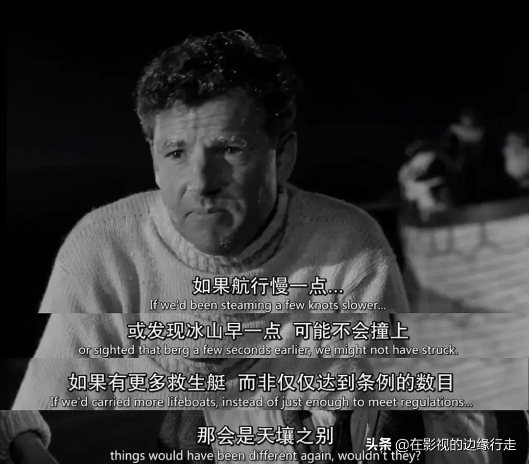 因为它不营造冲突,而是冷静客观细致地描述灾难突发全程,同纪录片相比,它足以于细小处反映危机时刻世情人情的种种情形,而不至于比肩同题材纪录片严肃得令人望而却步。在此片中,它还臻于了一种微妙的平衡,使冰海沉船不是噱头也不仅是灾难,而是永恒的人类寓言,它的警示意义远远甚于娱乐意义。这就是它超越新版的地方。