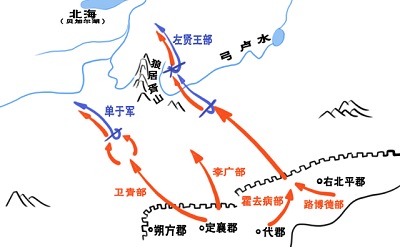 汉武帝元狩四年(前119)春天,汉武帝刘彻觉得时机已成熟,是时候给一向猖狂的匈奴人致命一击了。于是他下令命卫青和霍去病这舅甥俩各自率领五万骑兵十万步兵分别从定襄和代郡出发,深入大漠去寻找并歼灭匈奴的主力部队。