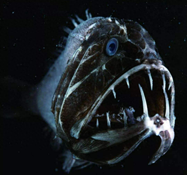 当来到海底五千米的时候,就是尖牙鱼的巢穴了,这种鱼也因为水压过高的原因长相十分恐怖,而且由于海底生物数量稀少,食物匮乏,因此这种尖牙鱼也逐渐演变成了杂食生物,上面掉下来什么就吃什么,毫不挑剔。