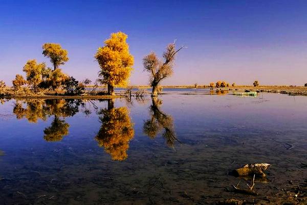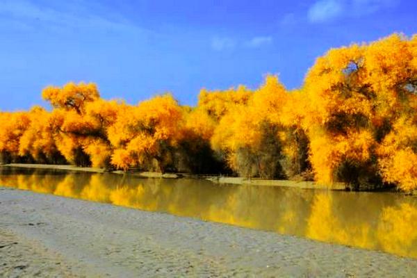 塔里木河边有着许多不名小湖泊,碧波荡漾、清澈见底、蓝天白云、在金色胡杨倒映湖水中,随着迷人的秋色有如人间仙境。如此美丽,如诗如画。不到新疆不知胡杨之壮美,不见胡杨不知生命之辉煌。