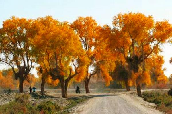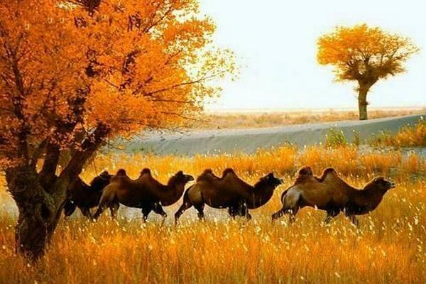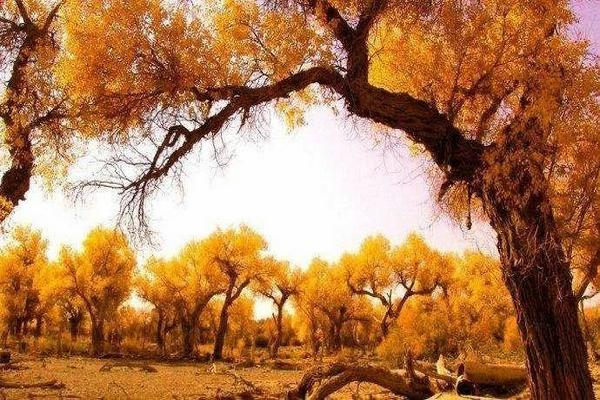 在“大漠弧烟直”的塔克拉玛干沙漠,和“长河落日园”的塔里木河畔,有着一望无垠的天然野生胡杨林。呈现出一派金色壮美的景观。阳光下油光闪亮的胡杨技条树叶,飒爽英姿,秋风轻轻吹拂,金黄的胡杨树叶与一望无际的大漠交相輝映,呈现出一派金色的海洋。