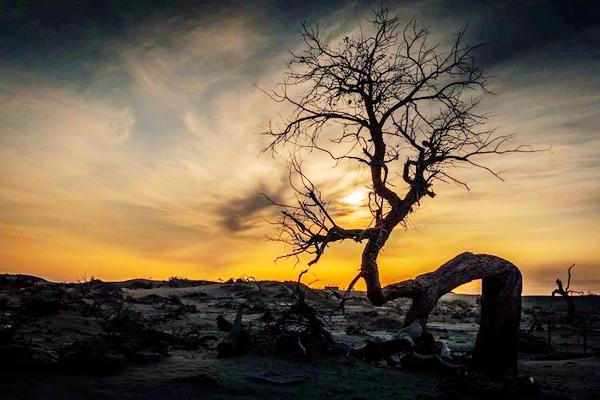 让人顿觉心灵在震撼,生命在升华、大漠如同大海的胸怀,是那样的宽广坦荡,更有与大漠终年为伴常年厮守的胡杨是那样雄伟高大。还有那死而不倒的枯杨,古朴苍劲、形态各异的躯干呈现出它刚毅的个性,多姿多彩的造型,胜似鬼斧神工的杰作,尽情地向世人展示着它们曾经有过的辉煌。倒地的胡杨与仍然站立的胡杨,就像互相陪伴着的一对对千年情侣。
