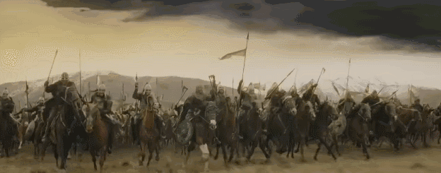 战争场面宏大壮阔,用反复出现的俯拍拉伸镜头,给我们呈现出旌旗遮日,人马飞驰的场景,真的是让人心驰神往。