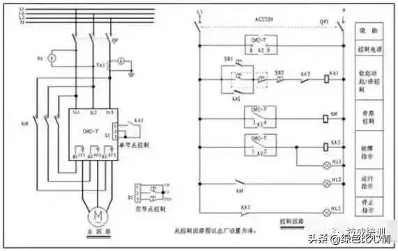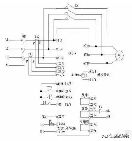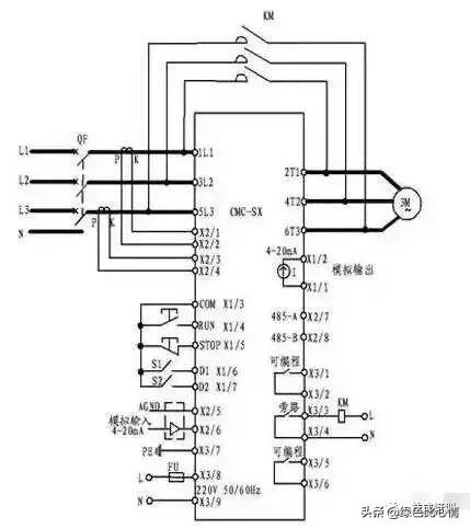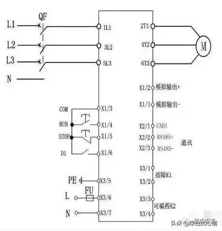 1.上图所示为单节点控制方式。接点闭合软起动起动,接点打开软起动器停止。但要注意这种接线LED面板起动操作无效。端子3、4、5起停信号是一个无源节点。