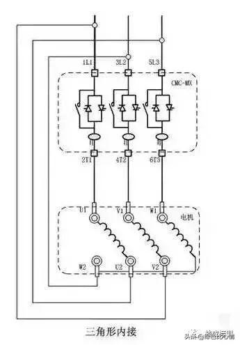 若用户使用三角形内接连接时,用户必须严格按照下图进行连接,否则有可能导致电机或软起损坏。本机在启动前会对电机接线进行判断,若接线错误软起会报接线错误故障。
