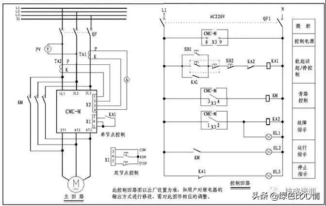 1.上图所示为单节点控制方式。接点闭合软起动起动,接点打开软起动器停止。但要注意这种接线LCD面板起动操作无效。端子3、4、5起停信号是一个无源节点。