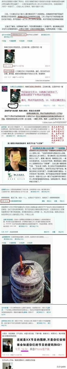 1.主持人黄小姐,在其微博写道:韩庚迟到一小时,2点录制,2点40分才到现场,歌迷空等等信息。某网站也有相同的话,那么请问,大牌生日会根据地是否是贵节目在新浪微博的官方ID?如果是的话,贵节目ID在13:25分发的微博,韩庚已经达到录制现场,正在换衣服,这里说的韩庚,是否是当事人韩庚?如果是的话,那么黄小姐的话就与其矛盾,又何来迟到一说?