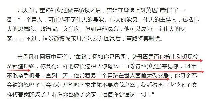 结果宋丹丹愤怒转评,透露自己被激怒不是没有原因的,她一直等着英达来见巴图,为此14年都不敢换手机号,直到有一天,他带着另一个男孩在世人面前大秀父爱。