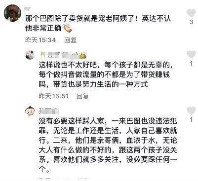 有人就直接拿他和同父异母的哥哥巴图作对比,拉踩巴图称“那个巴图除了卖货就是宠老阿姨了!英达不认他正确。”