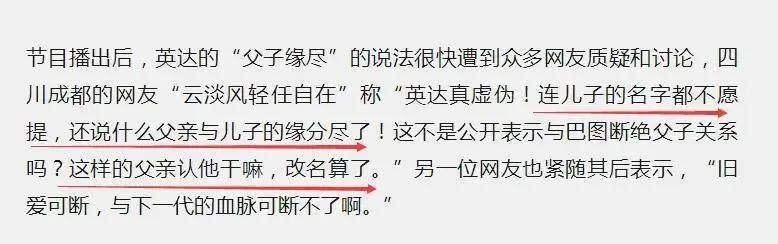 当时节目播出后,网友纷纷痛骂其虚伪,称其是在公开表示与巴图断绝父子关系。