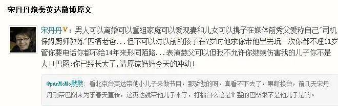宋丹丹曾在微博上炮轰英达,指责其14年对儿子巴图不管不问。