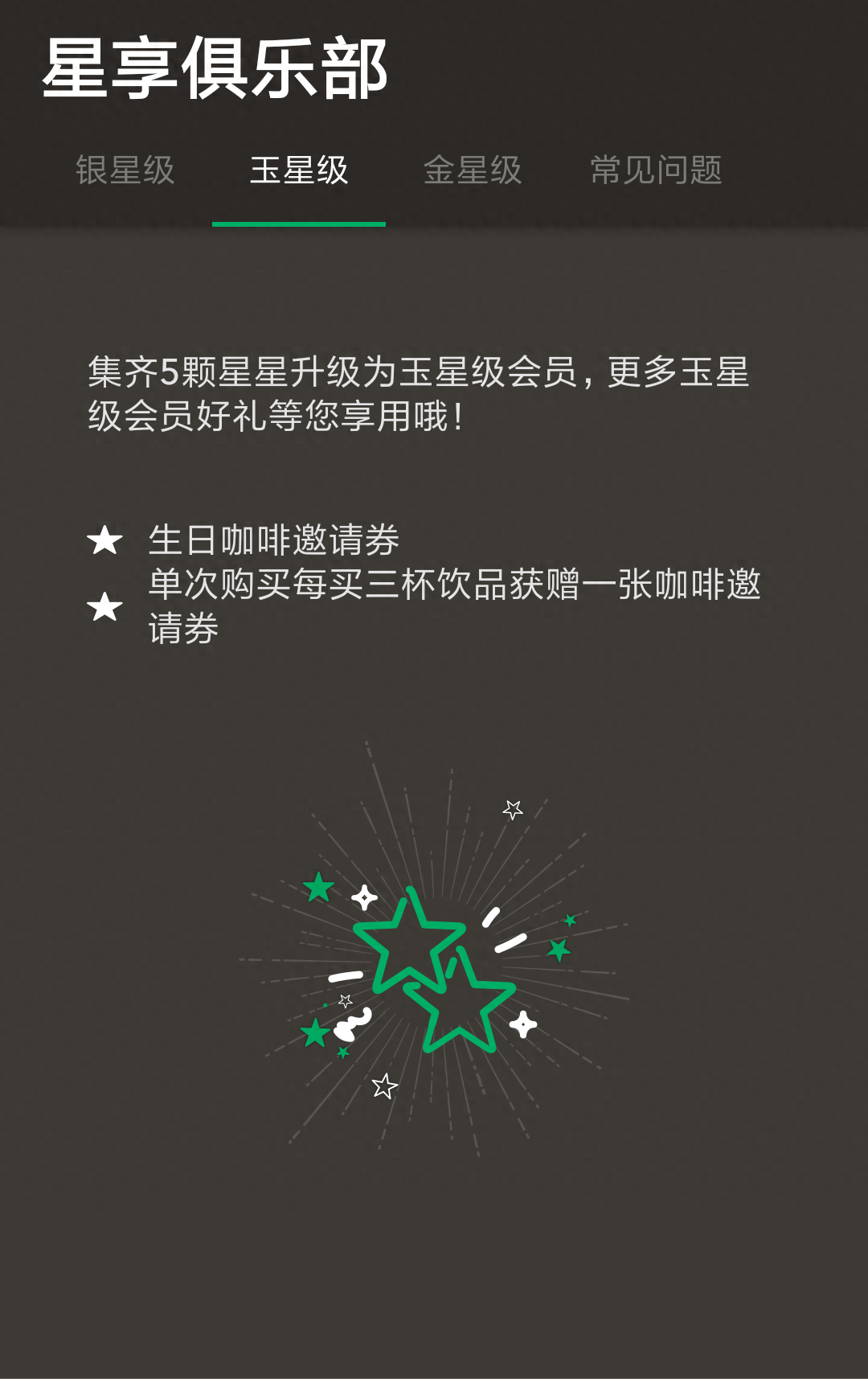 如果一年内消费满1250块钱,就是25颗星,那就是金卡会员了。金卡出了上面的特权,还新增买十送一,就是消费10次送一杯,不是一次买10杯。另外一个就是周年庆券,也是一张免费饮料券,每年在你买卡的那个月送到卡里。