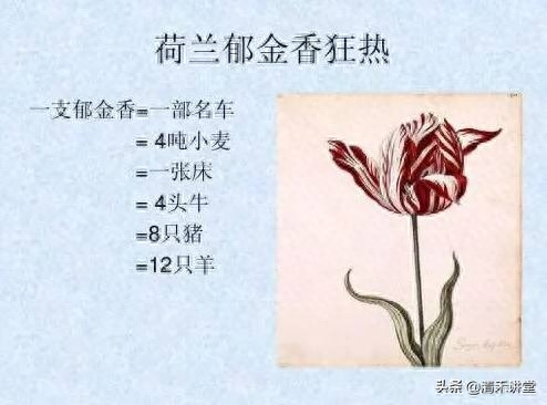到1636年,根据最狂热时的原始记载,对于一种被称为"永远的奥古斯都"的稀有郁金香品种,每个球茎的价格相当于:4600荷兰盾、一辆新马车、两匹母马,以及全套马具。那个时代一头肥壮的公牛才值120荷兰盾,不难想象4600荷兰盾是多么大的一笔财富。另外呢,还有一种被称为"总督"的稀有郁金香品种,在当时一株的价格是:24车的粮食、8头肥猪、4头奶牛、4桶啤酒、l000磅奶油和几吨的奶酪。而在巴黎一枝最好的郁金香花茎的价钱相当于110盎司的黄金。1盎司是31.1克,合计3421克黄金,接近七斤啊朋友们,简直比当年炒的热得发烫的切糕还要火得多的多。