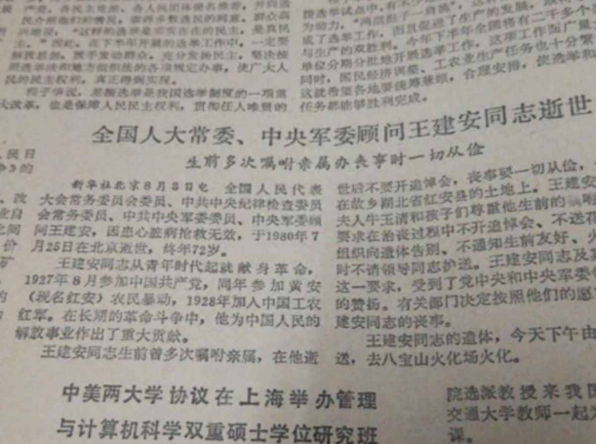 1980年7月25日,开国上将王建安因心脏病复发,在北京逝世,他的四个孩子也没来得及见父亲最后一面。