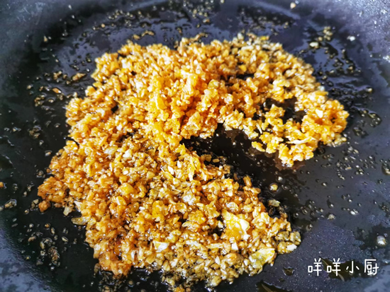 3、 锅中放油加热到5成热,放入一半的蒜蓉,中小火炒至金黄即可。