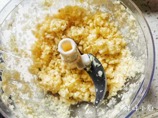 2、将大蒜去皮用料理机打成蒜蓉,也可以用手工剁成蒜蓉。