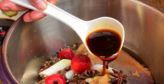 5、现在开始调味,放入生抽、老抽上色,黄豆酱,如果喜欢吃辣的话,也可以放入豆瓣酱,再放入少许白糖提鲜,然后盖上盖子 大火高压20分钟,如果是普通的锅至少要90分钟。