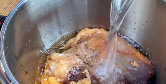 3、牛肉腌好之后,放入高压锅里面,如果没有高压锅的话,放入普通的锅里面也可以,倒入清水,清水一定要没过牛肉,如果要用普通的锅,要倒入更多的清水。