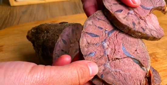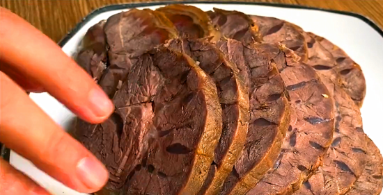 6、煮熟的牛肉,用筷子试一下,能用筷子轻轻扎动,这说明就熟了。煮熟的牛肉取出来,现在就可以吃了,闻着香喷喷的,特别的有食欲。
