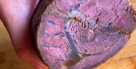8、冷藏好之后,美味好吃的酱牛肉就做好了,切开看一下,筋花特别的漂亮,不用加盐,吃着特别的好吃,切成片状就可以直接吃了,操作起来特别的简单,简直就是零失败。