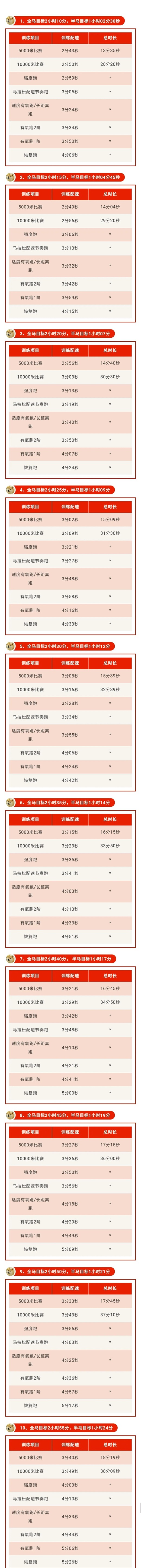 以上就是各阶段训练的配速表,需要提醒的是,表中所列的各项目的配速,并不是说每次跑步都要按这个速度来,这只是一个参考值,平时训练有一些快慢几秒的差异也属正常,不必过于纠结。