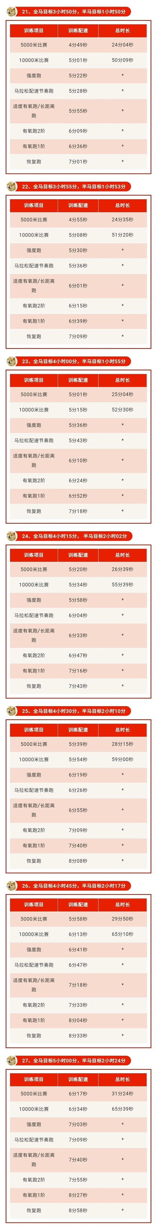 这里有一个误区希望一些跑友要纠正,这是一个训练表,而不是成绩对照表,也就是说,想要达到预定目标,至少要按照表中的配速去练,这一点还是要区别开的。
