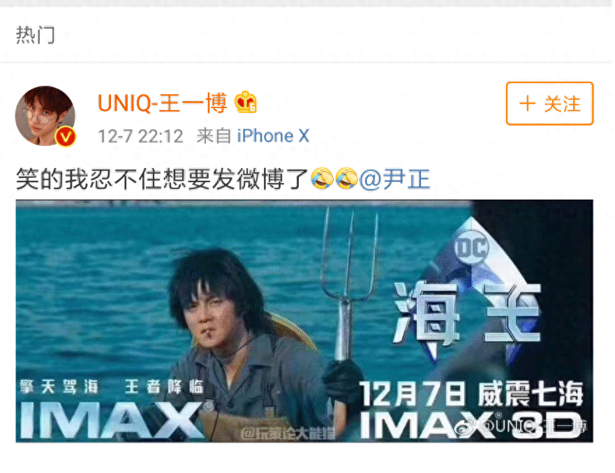 起因是王一博看完《海王》之后在自己的微博艾特尹正:“笑的我忍不住想要发微博了”,并配上了尹正的电影截图,P上了《海王》的海报文字。