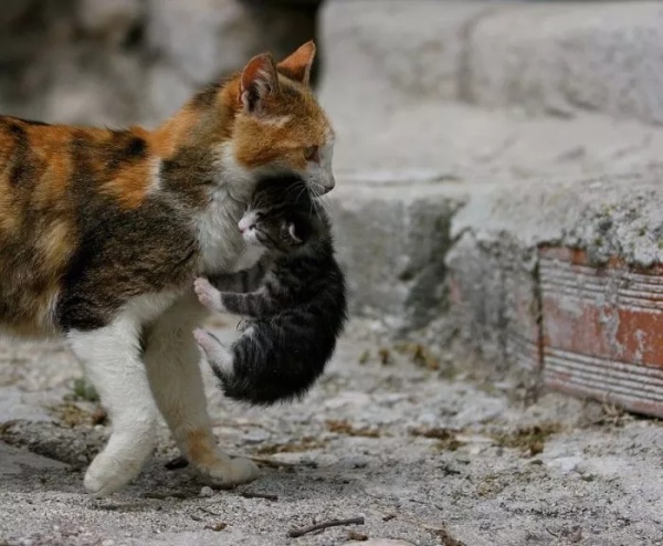 只要被叼着脖子后面的肉,小猫大脑就会自动发出一些信号,引导它们做出更方便猫妈运输自己的生理举动。