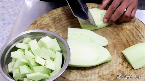 1.首先我们准备一下食材,青茄子一个,先把蒂切掉,再削去外皮,然后把茄子切成均匀厚片,再改刀切成菱形块备用。