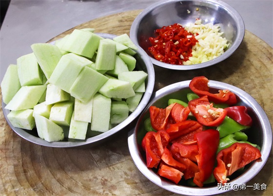 2.青红椒各一个,去蒂后,切成大小均匀的滚刀块,青红椒用来配色比较好看。