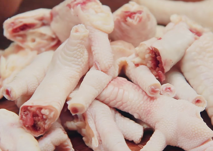 第一步:首先我们把鸡爪清洗干净,剁去脚趾甲,把鸡爪一刀两断,分成两份备用。