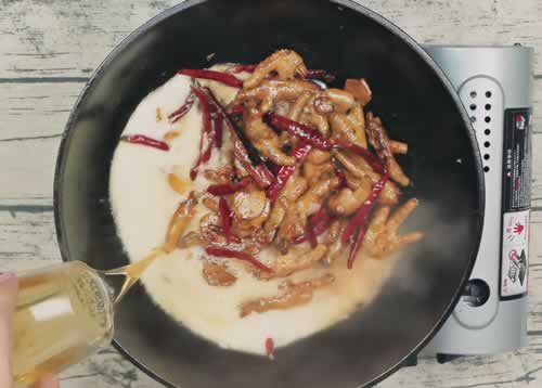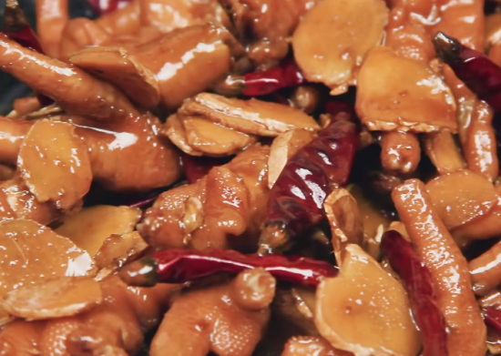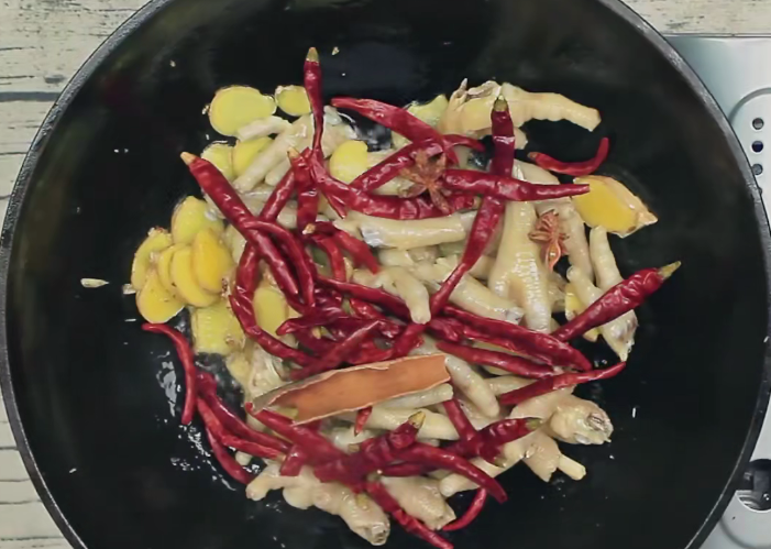 第四步:之后先倒入焯水好的鸡爪翻炒一分半钟,然后再把桂皮,八角,干辣椒一并倒入锅中,再次用大火翻炒一分钟。